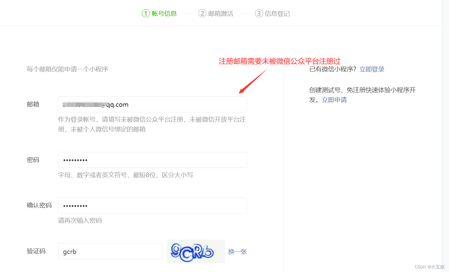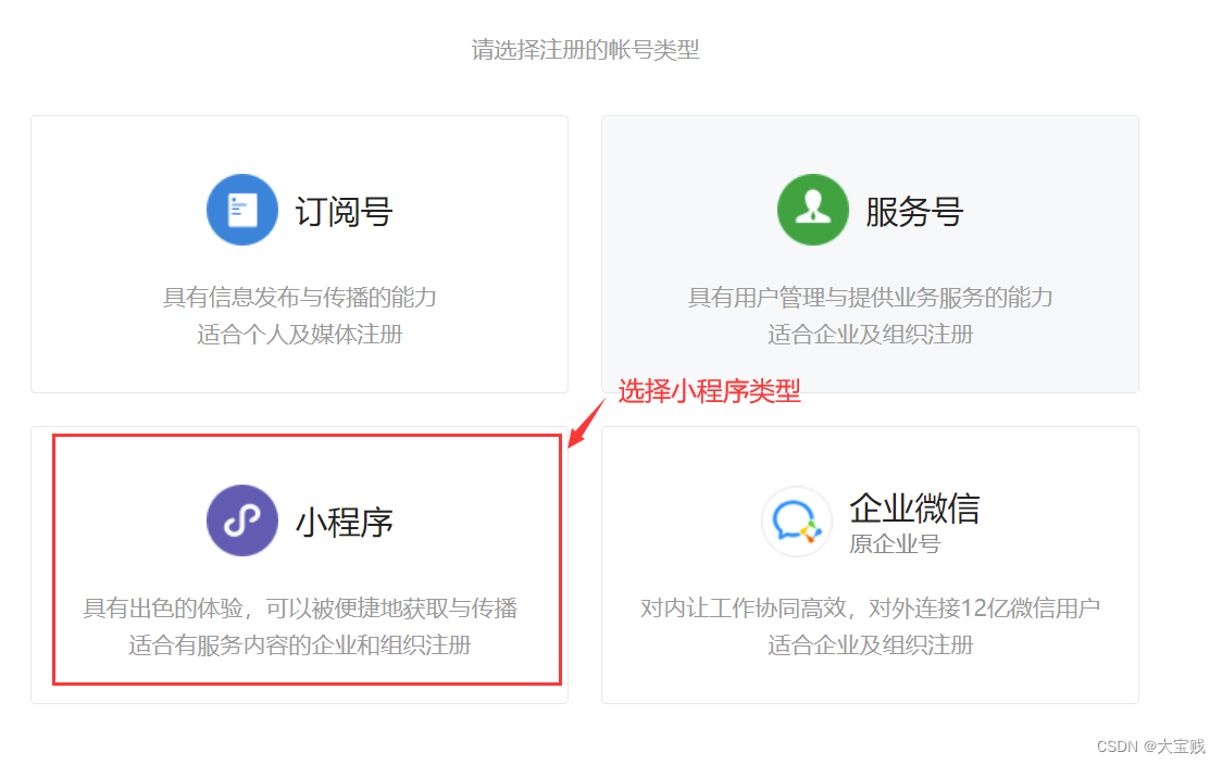 最后,我们还需要到微信公众平台 注册一个账号用于以后发布小游戏,注册顺序如下: