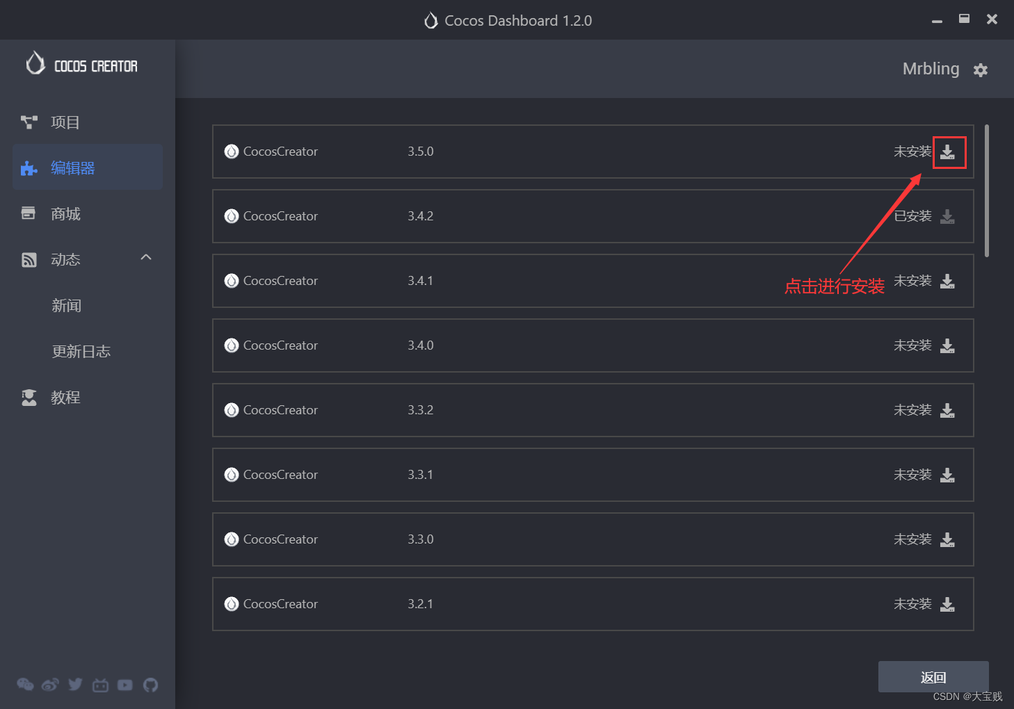 在编辑器页面列出了当前cocos creator的所有版本,目前最新的是3.5,我在开发这款小游戏的时候最新是3.4.2,选择对应的版本安装即可。