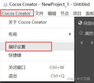 如果你的DashBoard里面安装了多个版本的编辑器,那么在“编辑器版本”那里一定要选择对应的版本,比如你到网上搜罗了一些开源项目,再导入项目的时候就要把对应的编辑器版本设置好,否则可能会出现兼容问题而导致项目无法运行。 Wordle这款游戏是2D的,所以我们选择“Empty(2D)”模板来创建一个2D空项目,设置好项目名称,项目文件路径后,点击“创建”后就会进入我们新建的项目了,第一次加载比较慢一点。点击左上角的“Cocos Creator”-->“偏好设置”
