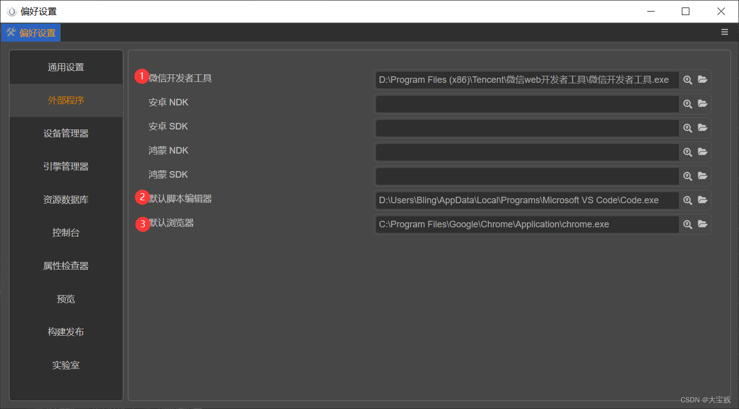 由于我是针对微信小游戏平台开发,所以安卓,鸿蒙那里就不用配置了,微信开发者工具,默认脚本编辑器,默认浏览器的配置路径一定要写到.exe的路径。