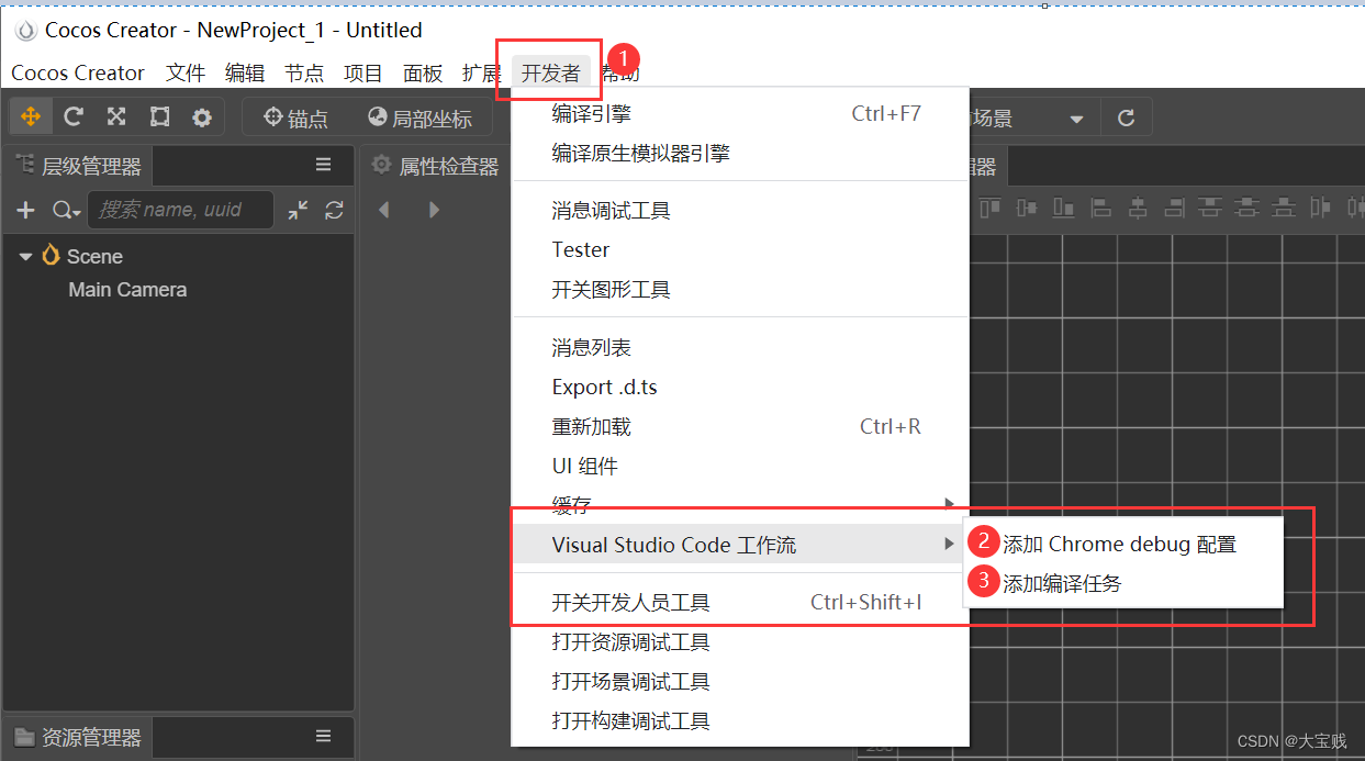 接下来需要配置VS Code的调试,选择“开发者”-> Visual Studio Code工作流,出现如下图所示两个选项,依次点击即可。