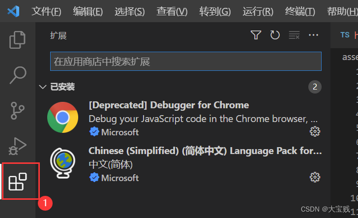 接下来再打开VS Code,选择扩展,安装如下两个插件,如果你的英文比较好也可以不用安装中文插件,安装也很简单,直接在输入框中输入插件名称搜索,点击安装即可。