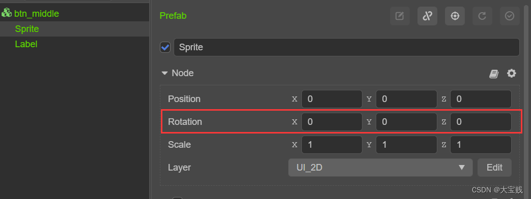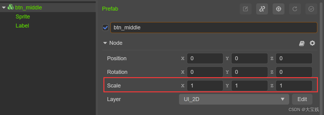 .union()这里简单介绍一下tween缓动组建的使用,tween缓动组件需要传递一个节点,并且可以在设置的时间内,改变传入节点的属性从而达到动画的效果。以上面的代码为例,btn_middle.ts脚本文件挂载到btn_middle这个prefab上,当btn_middle被加载的时候,btn_middle.ts中的类也被实例化了,此时类中的this.node就是指该btn_middle节点。所以tween(this.node)表示在btn_middle节点上的动画,.to(0.05,{scale : new Vec3(1.03,1.03,1)},{easing : 'backOut'}) 表示在0.05秒内,将节点的scale属性变化到1.03,1.03,1,scale属性在属性检查器中如下: