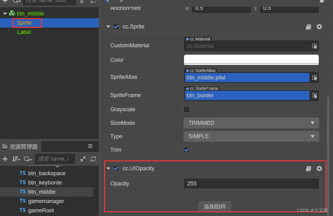 通过改变sprite的透明度来达到视觉上的闪烁效果。 由于node节点的属性只有上图中的4个,所以要实现透明度的改变则需要在sprite节点上挂载UIOpacity组件,如下图所示: