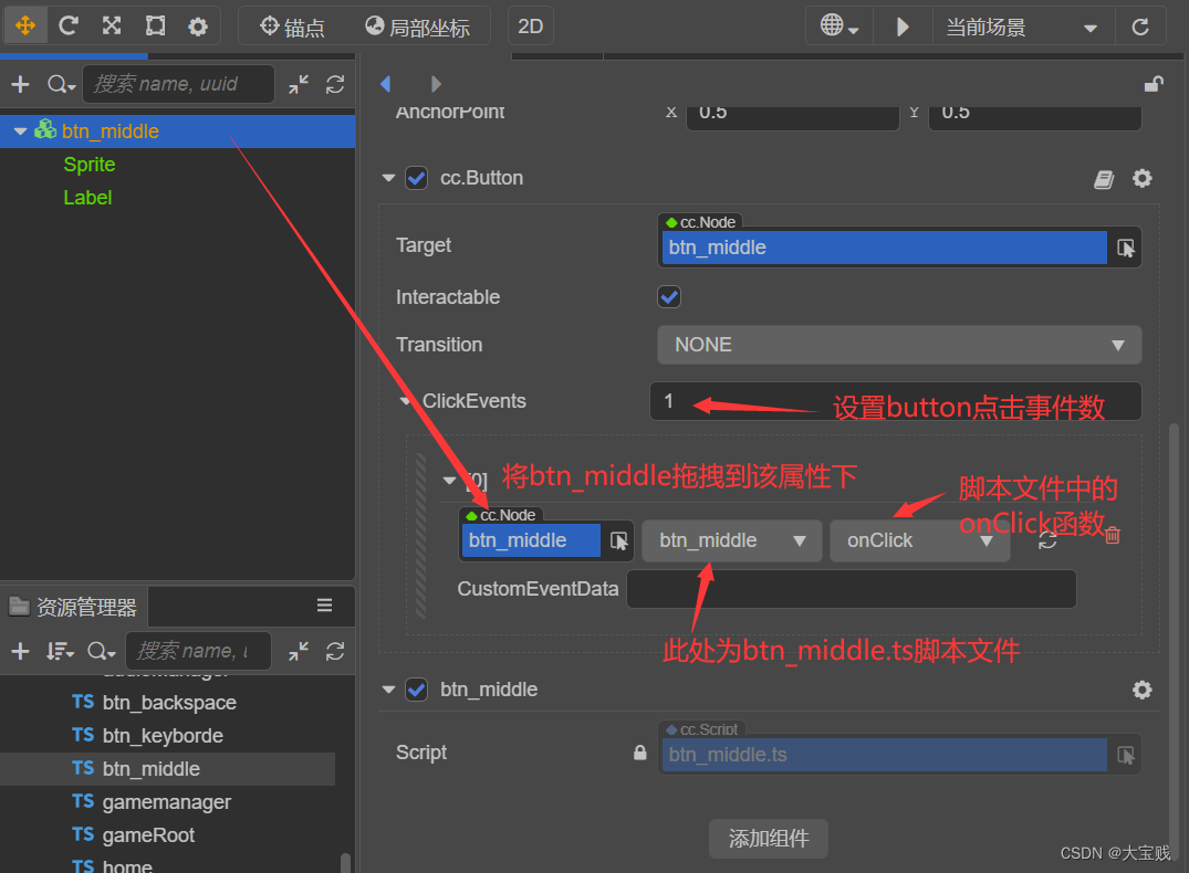 完成btn_middle.ts脚本后,就需要将该脚本挂载到btn_middle上面,并且绑定button的点击事件。在Cocos creator中的配置如下: