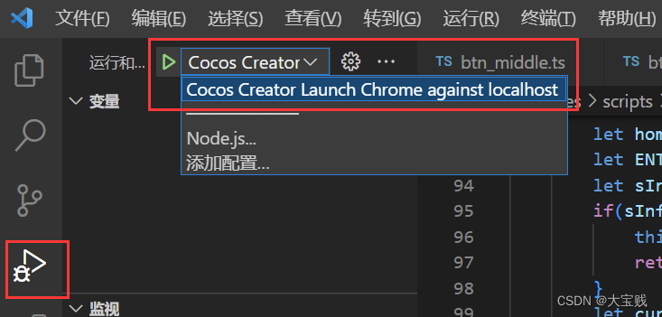 newBtnNode.getComponent(Button).clickEvents[0].emit(['click']);上述代码,模拟了button的点击效果,和用手点击的效果一样。此时可以先运行一下,看看“方块”的选中和输入效果并且做一些调试。如果你完成了教程一中的环境配置,在Cocos creator双击某个脚本文件就会在VS Code中打开该文件,并且可以看到调试运行中已经有了Cocos creator的调试选项,如下图所示: