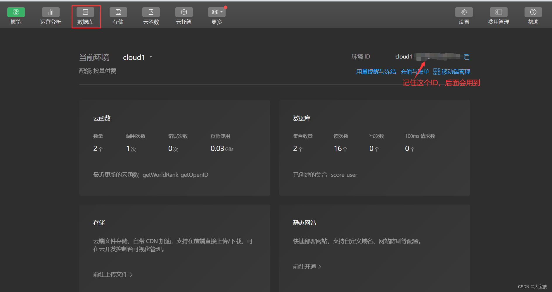 在“云开发”首页会显示“云函数”,“云数据库”等相关云资源的使用情况。右上角有一个“环境ID”,开发时会用到。点击“数据库”: