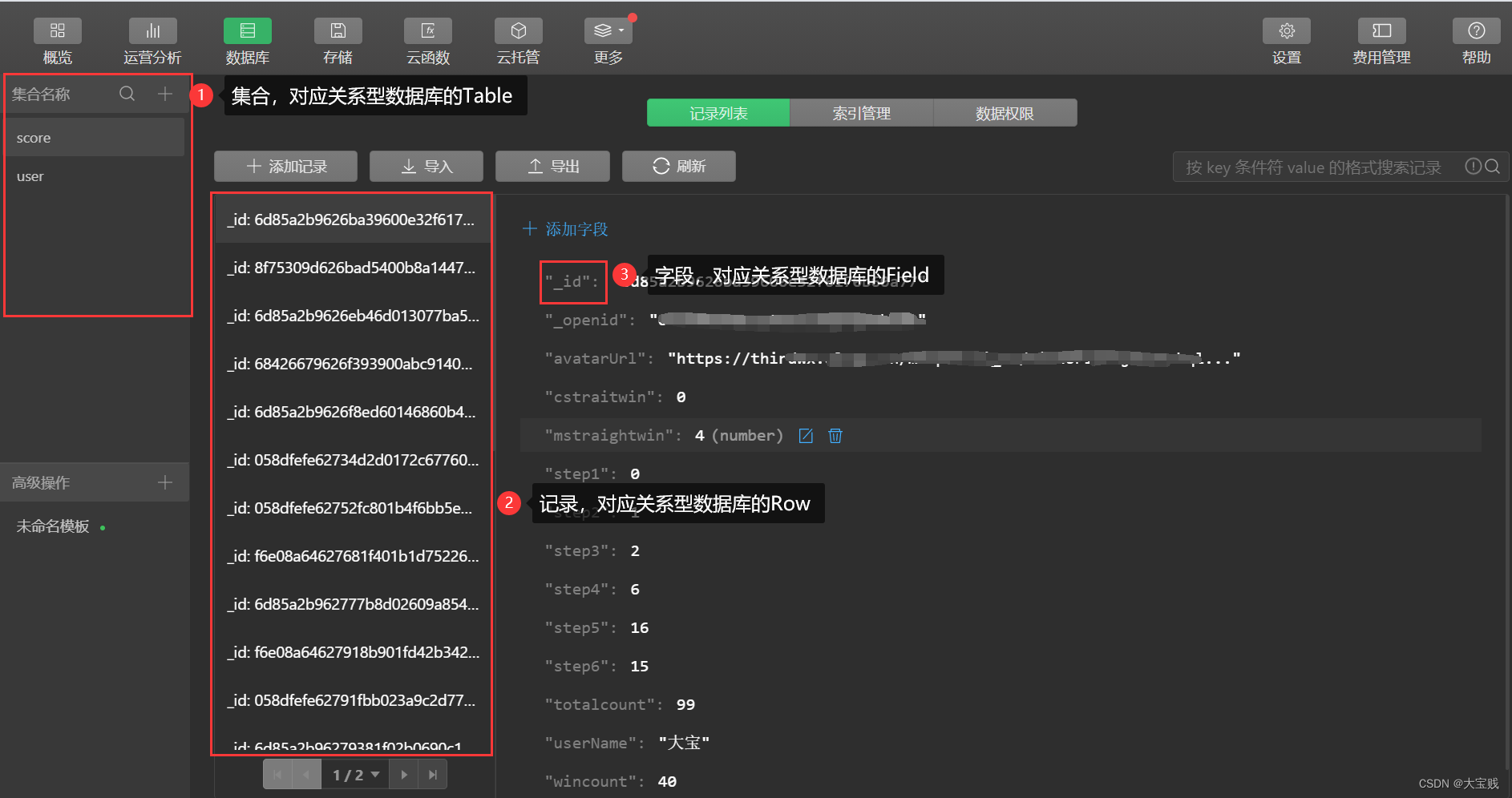 - 字段:这个和关系型数据库中的Field一样。 在“集合名称”那里点击“+”创建一个“score”集合用于存放玩家的战绩信息,字段可以不用先定义只需要在添加记录的时候把需要的字段传进去就行了(这一点和sqlserver、mysql等关系型数据库不一样)。通过调用微信云数据库API添加的记录会默认生成“_id”,“_openid”两个字段,这两个字段我们不需要维护,也不允许维护。