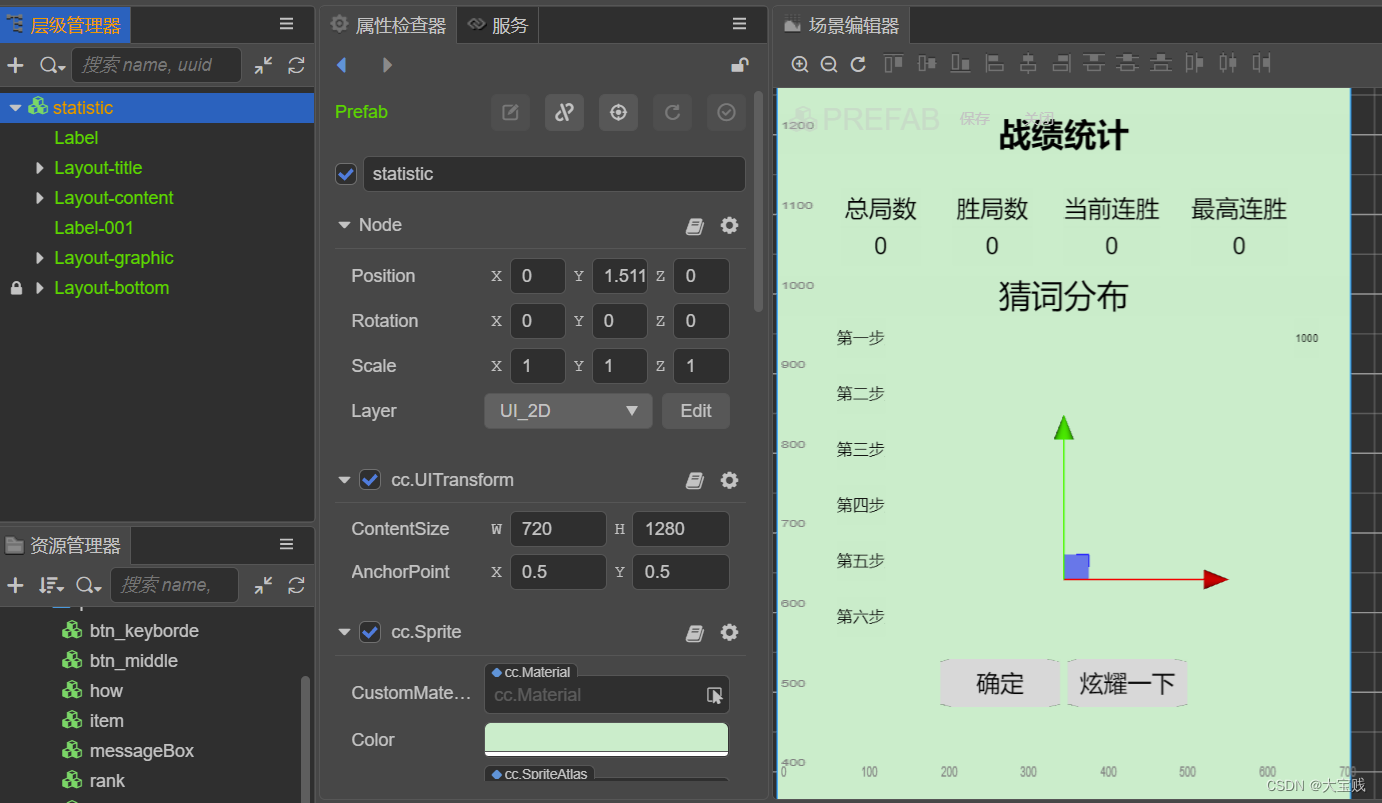 - 根节点statistic为Sprite(精灵):尺寸为720 x 1280和游戏设计大小一致。背景颜色设置为豆沙绿和游戏主界面的背景颜色一致。挂载widget组件,设置上下左右边距为0,这样能确保页面显示时能覆盖整个游戏区域。绑定statistic.ts脚本文件,实现战绩显示等相关功能。