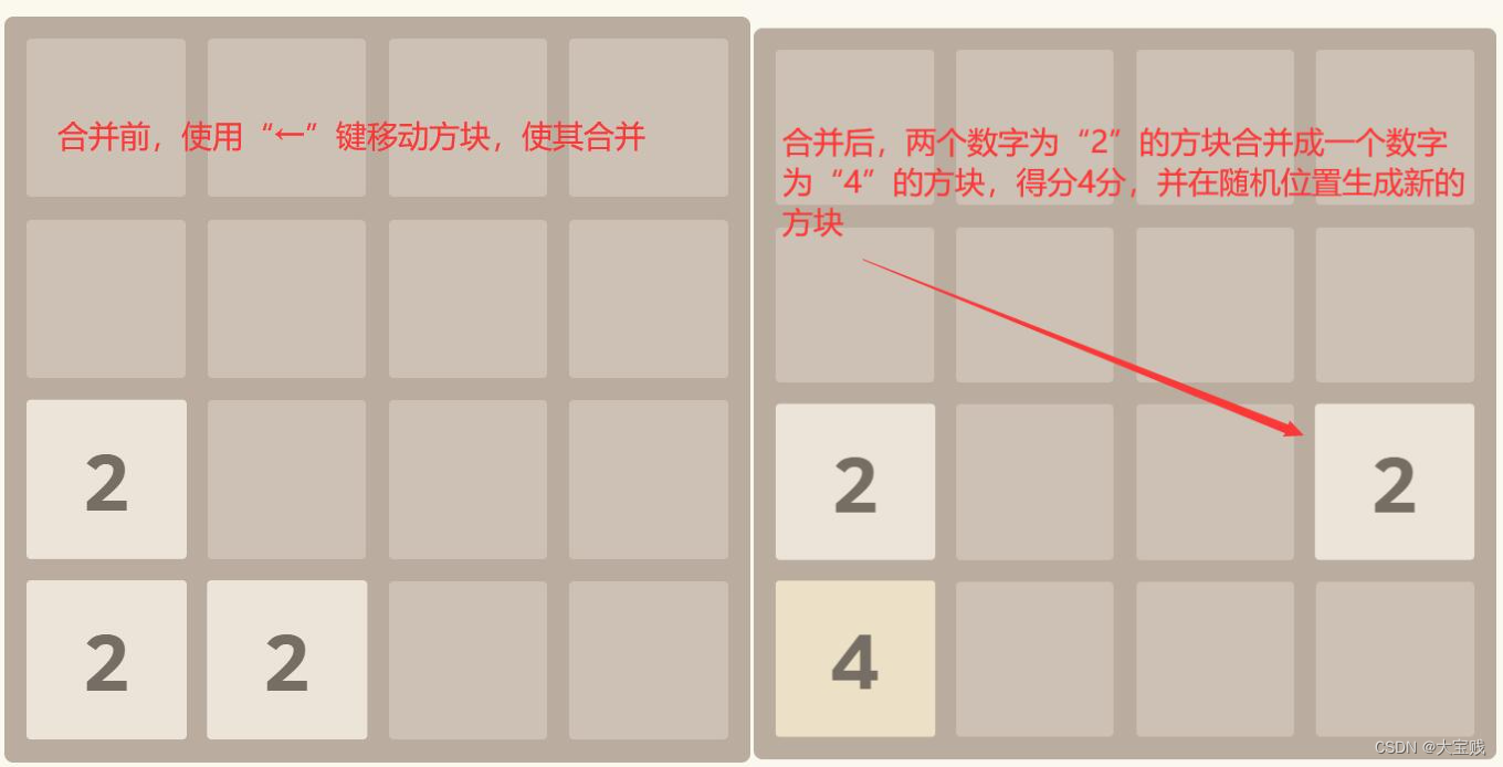 - 移动箭头键来移动方块,当两个相同数字的方块碰撞时会合并成一个方块。每次移动后,会在随机位置生成一个新的方块。